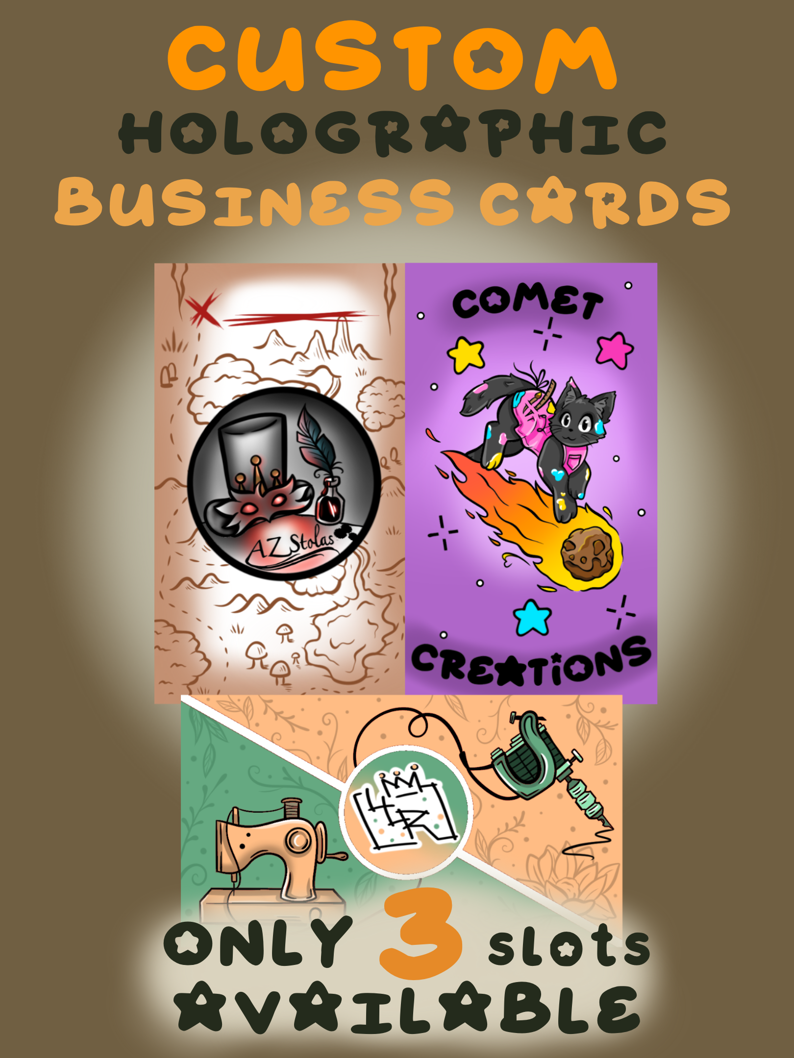 THEY ARE BACK!! Rae's Custom Holographic Business Cards are now available again for a short period of time! This is a first come first serve basis of signing up, and these fill up FAST for only having NOW 2 slots available. Below are more details to the Business cards!