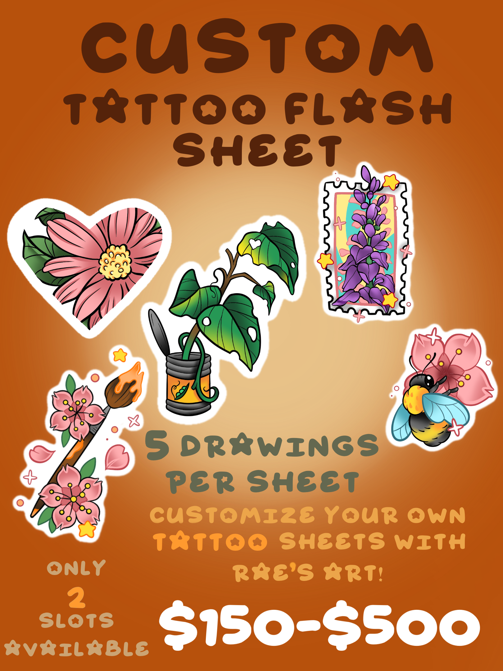 Do you want a sheet of your custom designs ready on the go for any tattoo artist to do for you? Today is your lucky day! With this Customizable Tattoo Flash Sheet, I will draw up 5 designs as flash, in any style and any background you'd like. You would receive a copy of the linework too, to help with the preparation phase. If you'd like to still get tattooed by me with this commission, we can set up a date to get you in after my recovery!