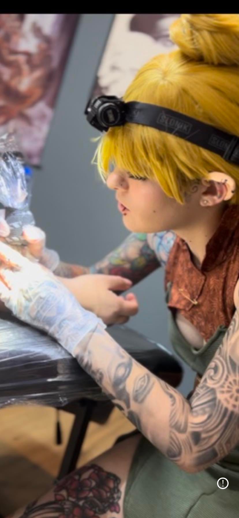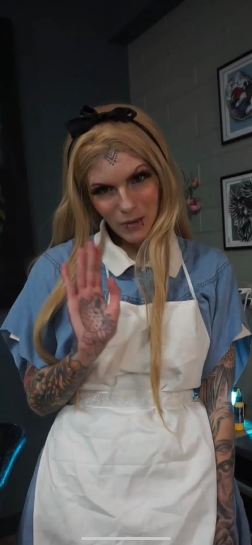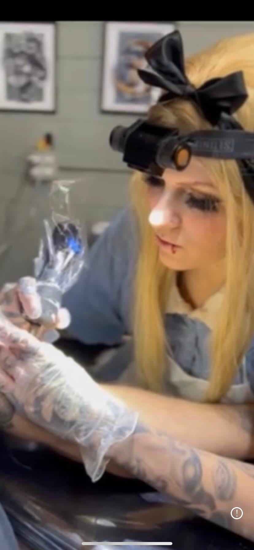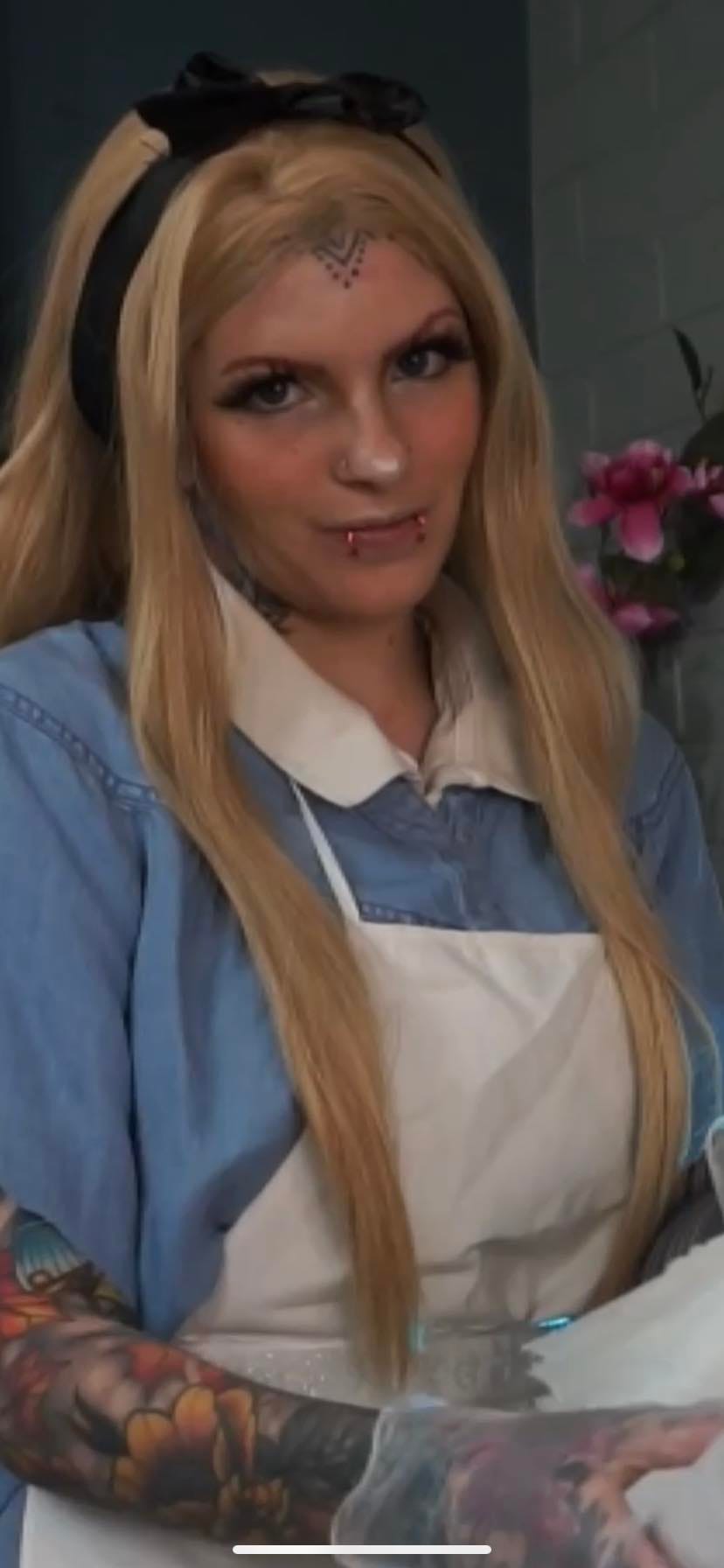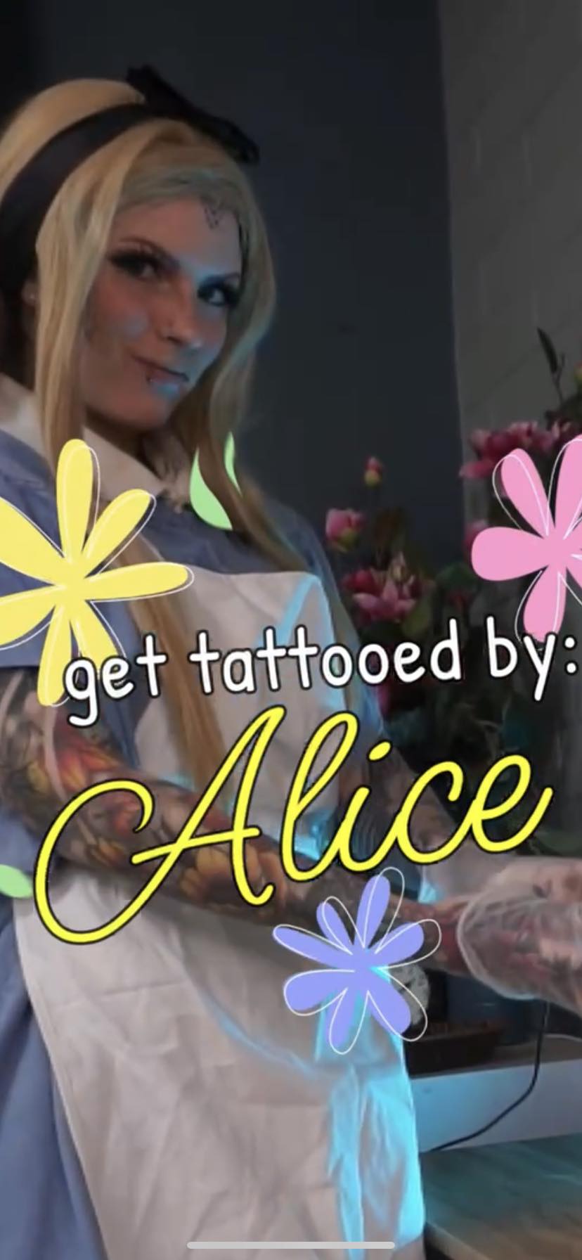"Until 2024, I had never seen Alice in Wonderland, since it wasn't something I either thought I would like or my mother did not show me growing up. One of my clients in 2024 had requested for me to tattoo in cosplay as Alice, so I quickly threw together a cosplay of her within 1 night. I sadly didn't have a blue dress so I had bought a large blue t-shirt and combined it with a white polo underneath, bow and petti skirt. This cosplay was extremely fast to make and something that I am very proud of! It meant a lot to me that my client enjoyed it!"