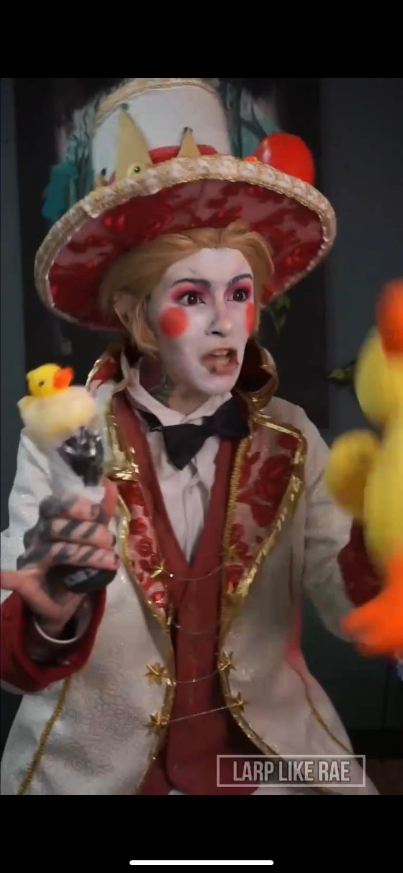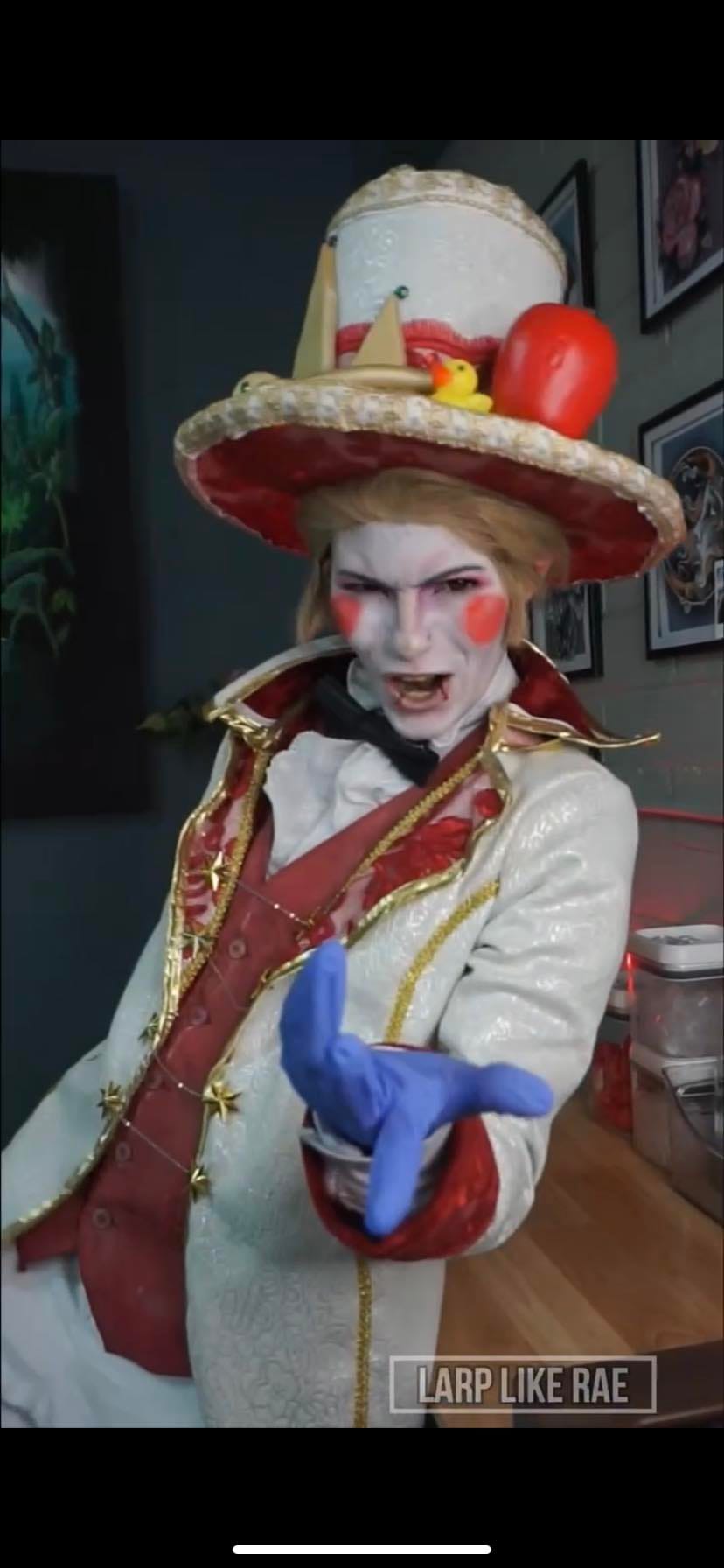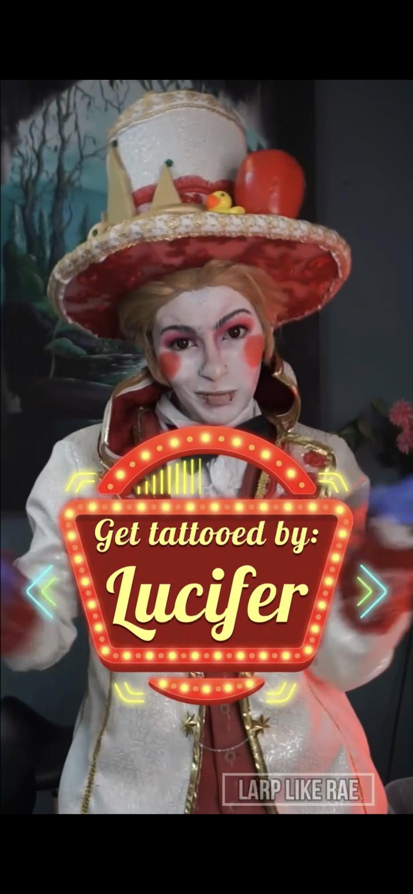 “After I decided to Cosplay as Charlie while tattooing in Cosplay, that video ended up blowing up and was viewed several thousand times. One of the main Cosplays that was requested on that video was to tattoo as Lucifer next. This character was something that I had already planned to make and create so it was a perfect opportunity to bring this Cosplay to the tattoo shop and tattoo a client as. Sometimes there are chances where clients do not request a Cosplay and I will still come into the shop as a character because I need content. This video did extremely well on all platforms yet the consistent thing that kept on happening was in the comment section people were upset that did not tattoo a rubber ducky. The client that I had tattooed in this Cosplay was wanting an anchor that meant a lot to her, and the fact that people were demanding a tattoo that that client would not want was quite disrespectful. It is something that some people will never understand. Because I had posted a video of me tattooing someone… that tattoo is 100% valid and people need to respect the choice of the client whether or not it relates to theCosplay or not. I would absolutely love to Cosplay as Lucifer again and tattoo as him however the hat is very annoying to tattoo with and gives me a crick in the neck HAHA!”