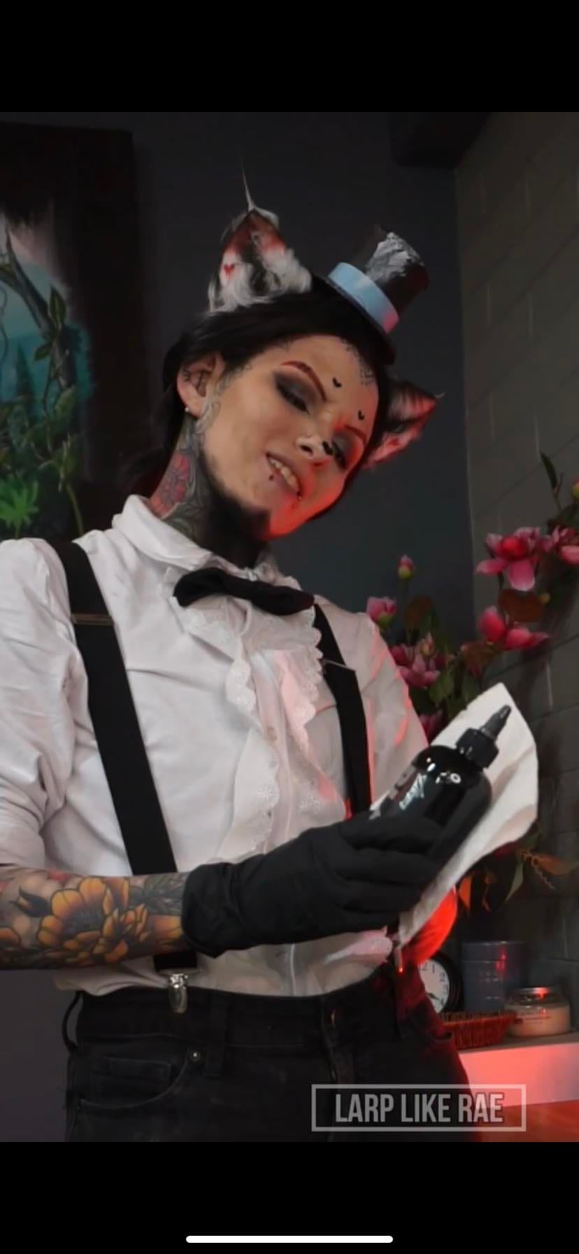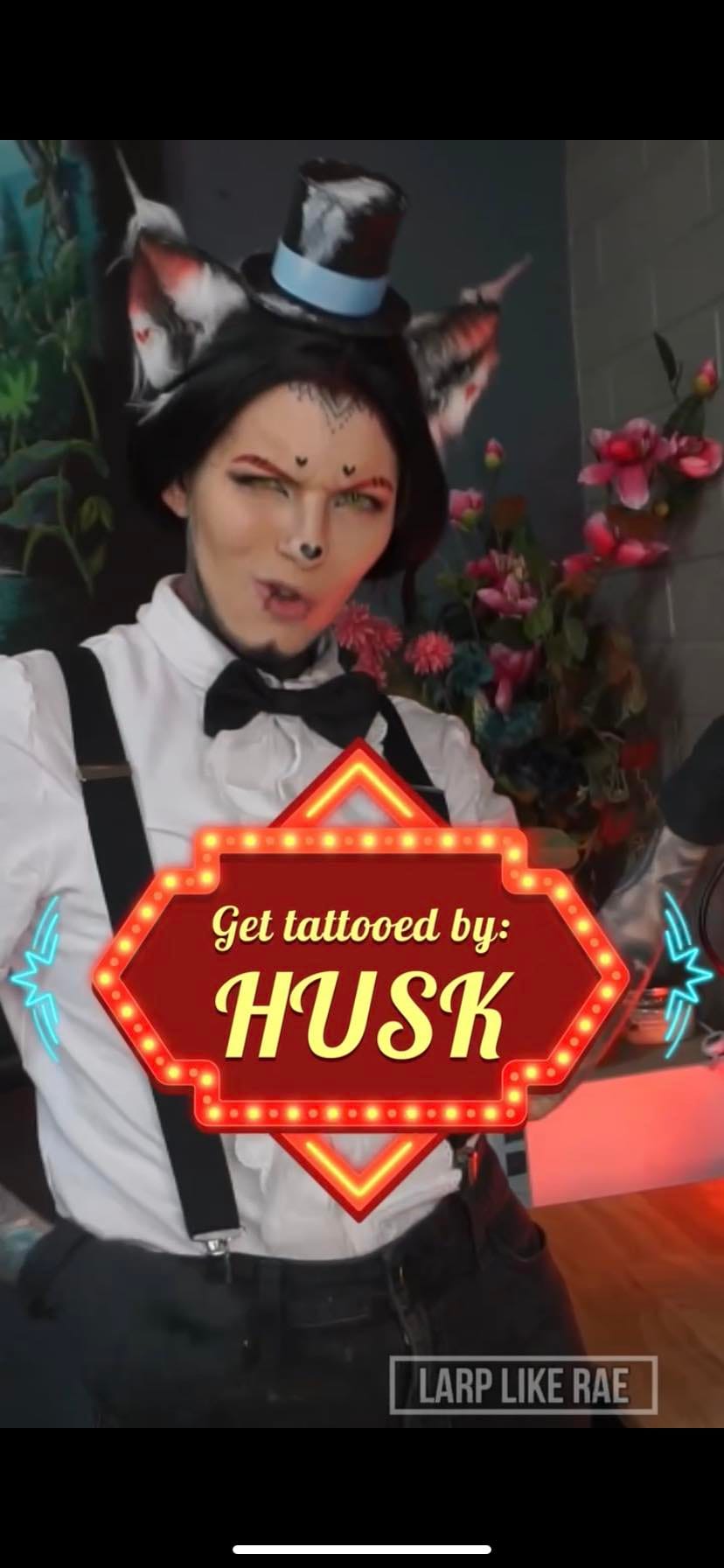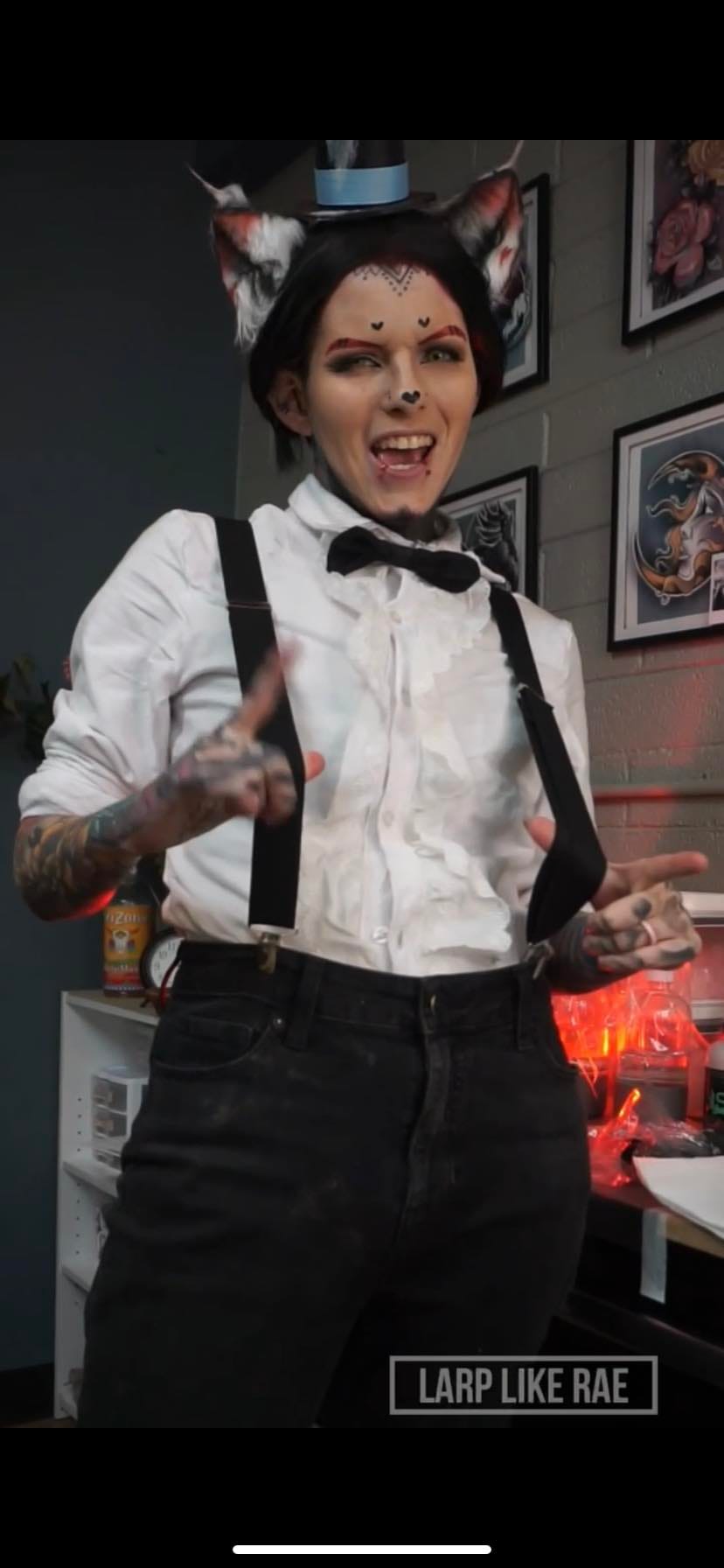 “Husk is a character that I quickly put together to cosplay as! I didn’t plan to make his tail or wings since it is a hassle to tattoo in those and this cosplay was mainly made to tattoo a clients in. I used items I already had such as suspenders, shirt, bow tie and ears! The ears were made in 2020 as a design I had made just for shits and giggles, turns out that those ears would work perfectly for him. Since then, I have made actual ears that I sell on this website for husk!! So if you are interested please go check them out!”