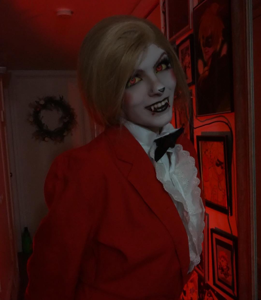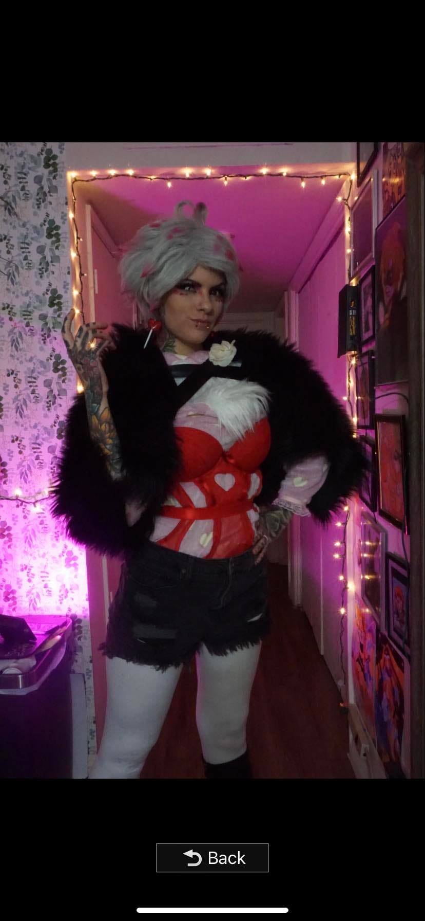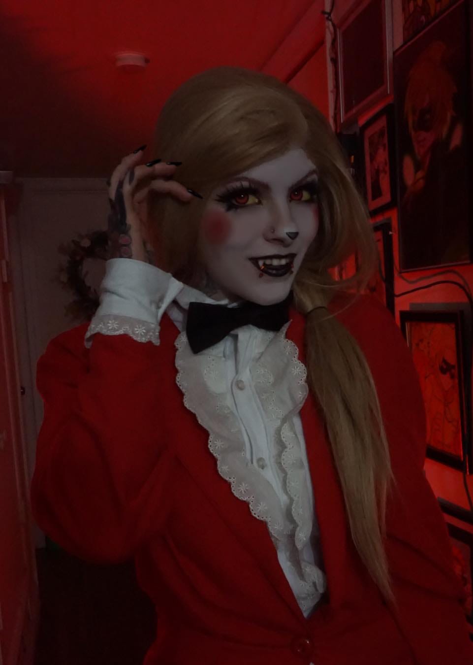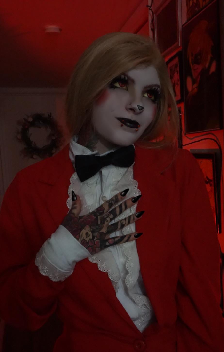 “Charlie was my first ever cosplay from Hazbin hotel that I had tattooed in Cosplay as. I remember, I wanted to cosplay as one of the characters from Hazbin Hotel when it first started becoming popular. I didn’t have much for the Cosplays, so I went with more of a casual outfit that I knew I already had such as Charlie! I already had the red pants, jacket as well as the bowtie and shirt. The only thing that was a little different that I couldn’t really customize was the wig. That blonde wig was meant for a lot of other characters, so I did not want to chop it up with bangs if I was going to use it for other characters being that length and style. However this entire cosplay turned out to be a huge success, and the video did very well and grew my audience on TikTok and YouTube just a little bit more!”