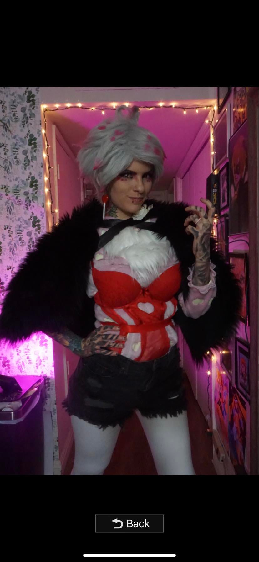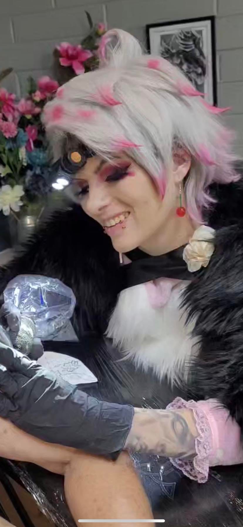 “When I was mainly doing all my tattoo in cosplay content from Hazbin Hotel, Angel Dust was one of the first cosplays after Charlie and Lucifer. I had thrown together his cosplay last minute by making the shirt and using things that I already had from other Cosplays. The wig was restyled from one of my old wigs from whenever I Cosplayed from Aphmau. I changed up the a lot on the outfit with more customized accessories and add-on’s, yet it was nothing canon that he actually wore. This outfit was extremely hot to wear in the shop and to tattoo in but I did love the way it turned out! If I did end up cosplaying as Angel Dust again while tattooing, I would probably change the outfit a tad that more!”