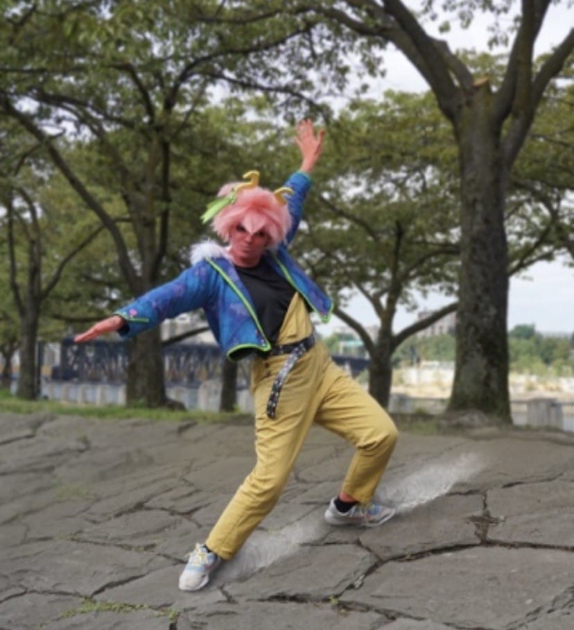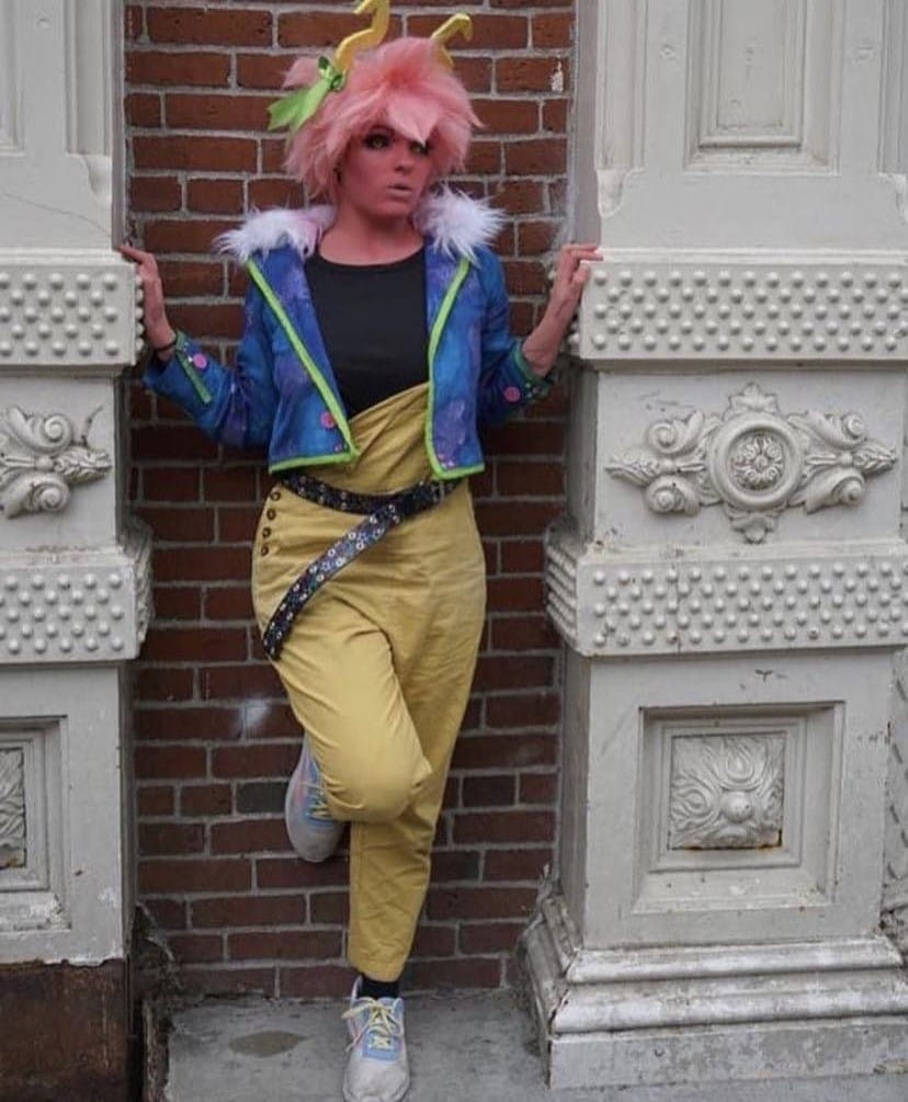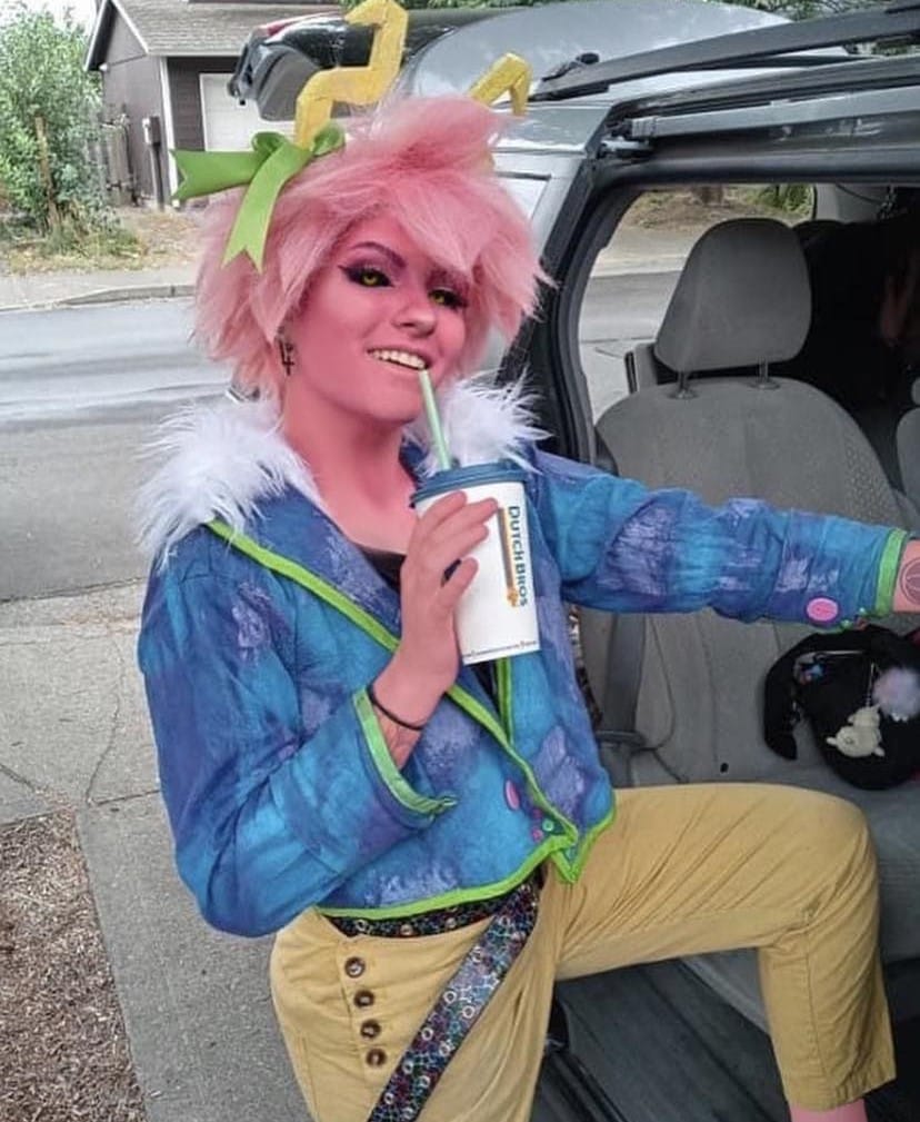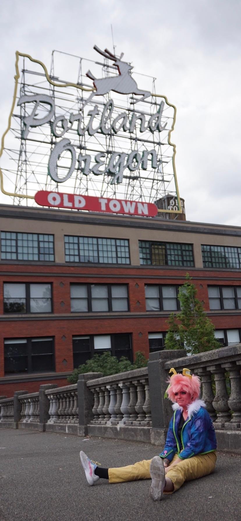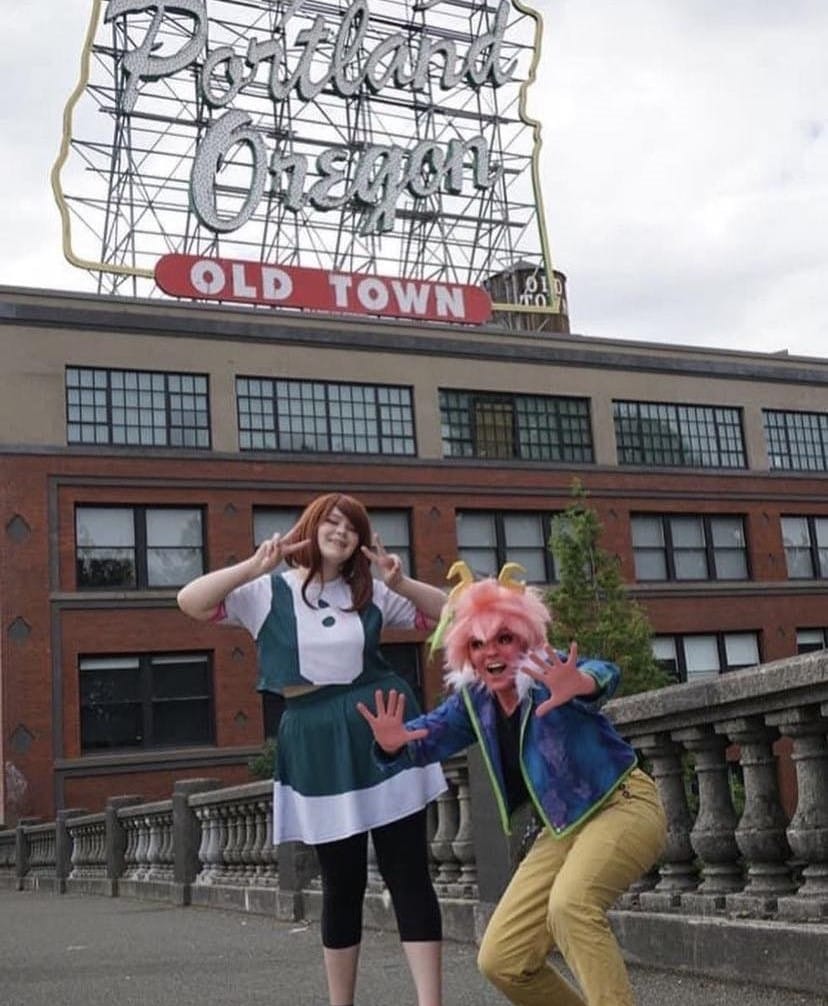 "In 2021 I had the opportunity to surprise my friend JJ (she/her) in Portland Oregon. Since this trip was a surprise orchestrated by her family and myself, I had to plan out what cosplays I wanted to take so that she could borrow some and we could make content together! One of the cosplays was Mina and Ochako. So I ended up making a casual version of Mina with yellow overalls, black shirt and a jacket that accented her hero outfit with fur and the name 'Queen' on the back in paint. These cosplays turned out so good and we made such amazing content and memories exploring Portland Oregon together!"