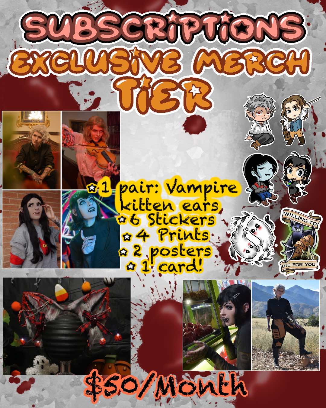 Package includes: 1 Pair of Vampire Kitten Ears, 6 holographic waterproof stickers, 4 cosplay prints, 2 cosplay posters, 1 card, 1 sale coupon sheet!
